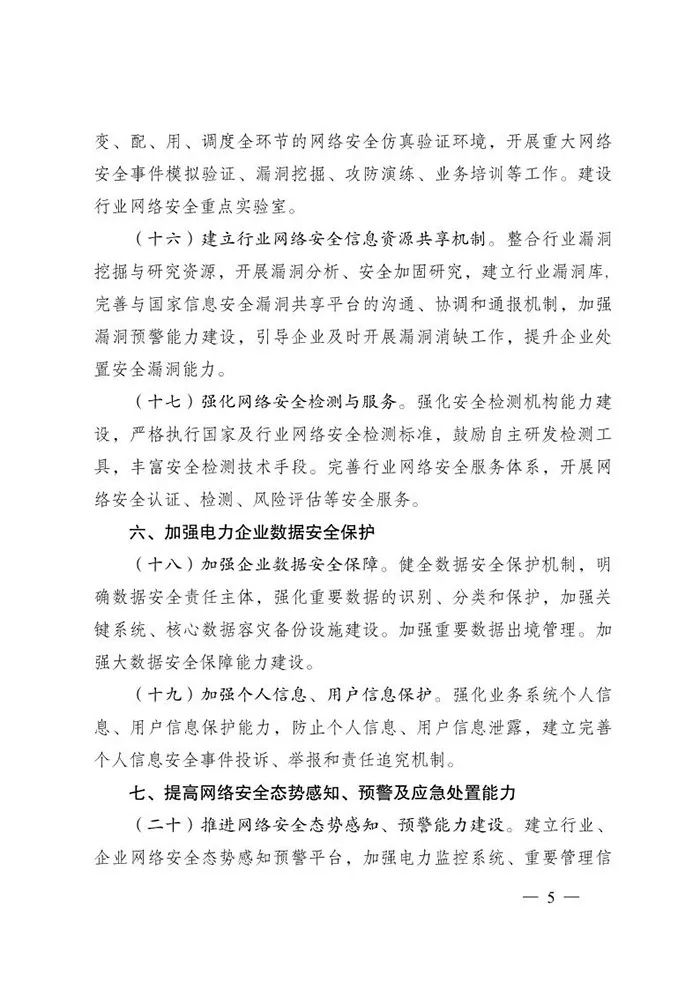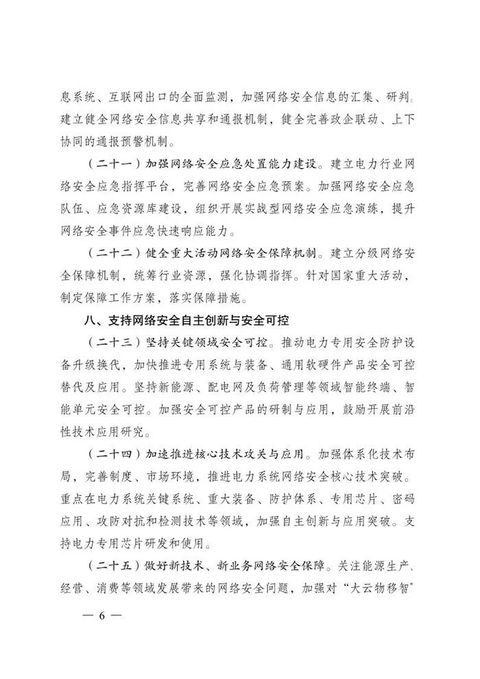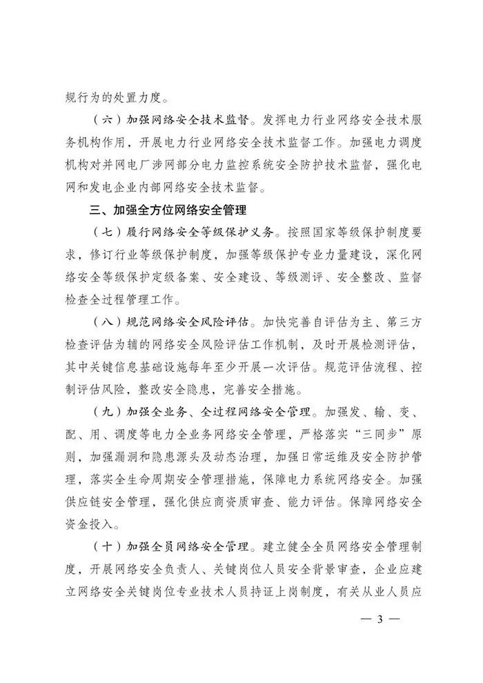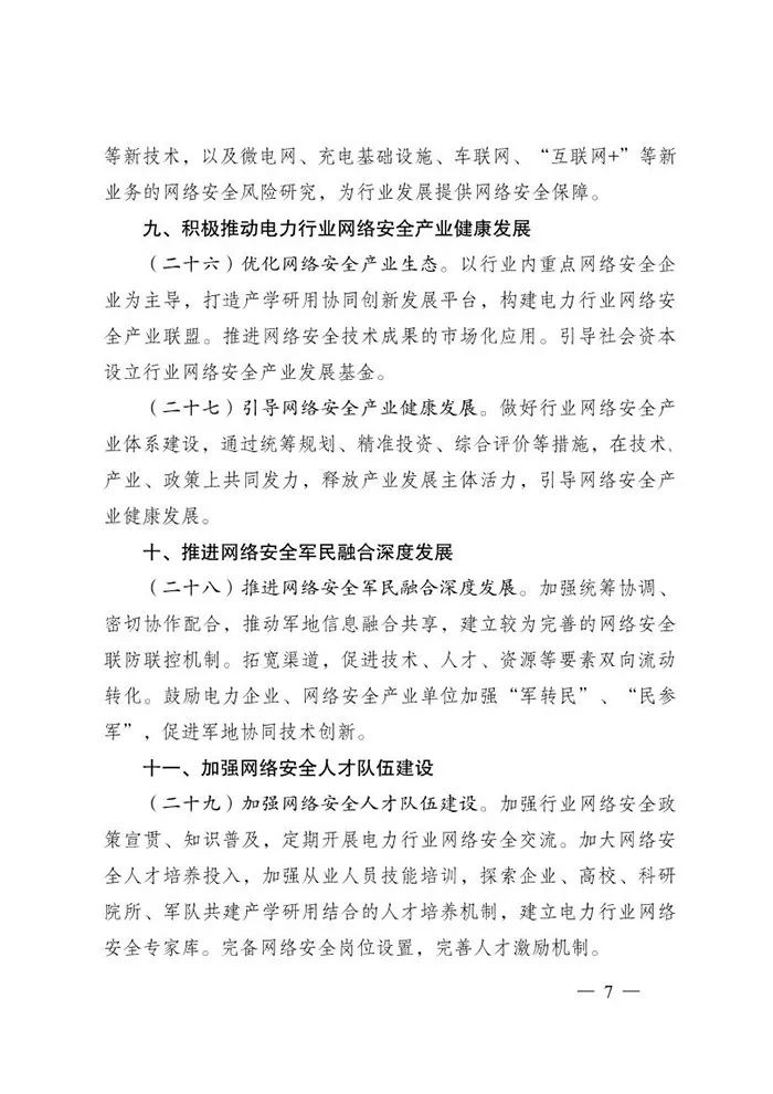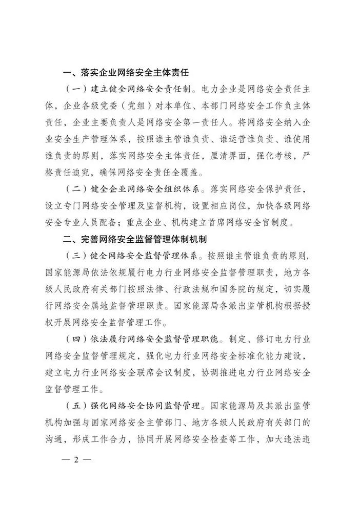 《意见》围绕进一步落实电力企业网络安全主体责任,完善网络安全监督管理体制机制,加强全方位网络安全管理,强化关键信息基础设施安全保护,加强行业网络安全基础设施建设,加强电力企业数据安全保护,提高网络安全态势感知、预警及应急处置能力,支持网络安全自主创新与安全可控;积极推动电力行业网络安全产业健康发展,推进网络安全军民融合深度发展,加强网络安全人才队伍建设,拓展网络安全国际合作等12方面提出30条具体要求。
