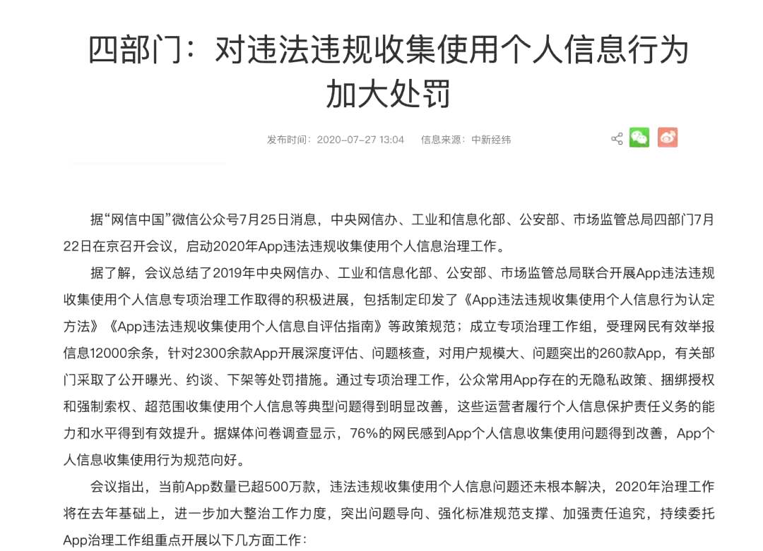 中央网信办、工业和信息化部、公安部、市场监管总局四部门7月22日在京召开会议,启动2020年App违法违规收集使用个人信息治理工作。