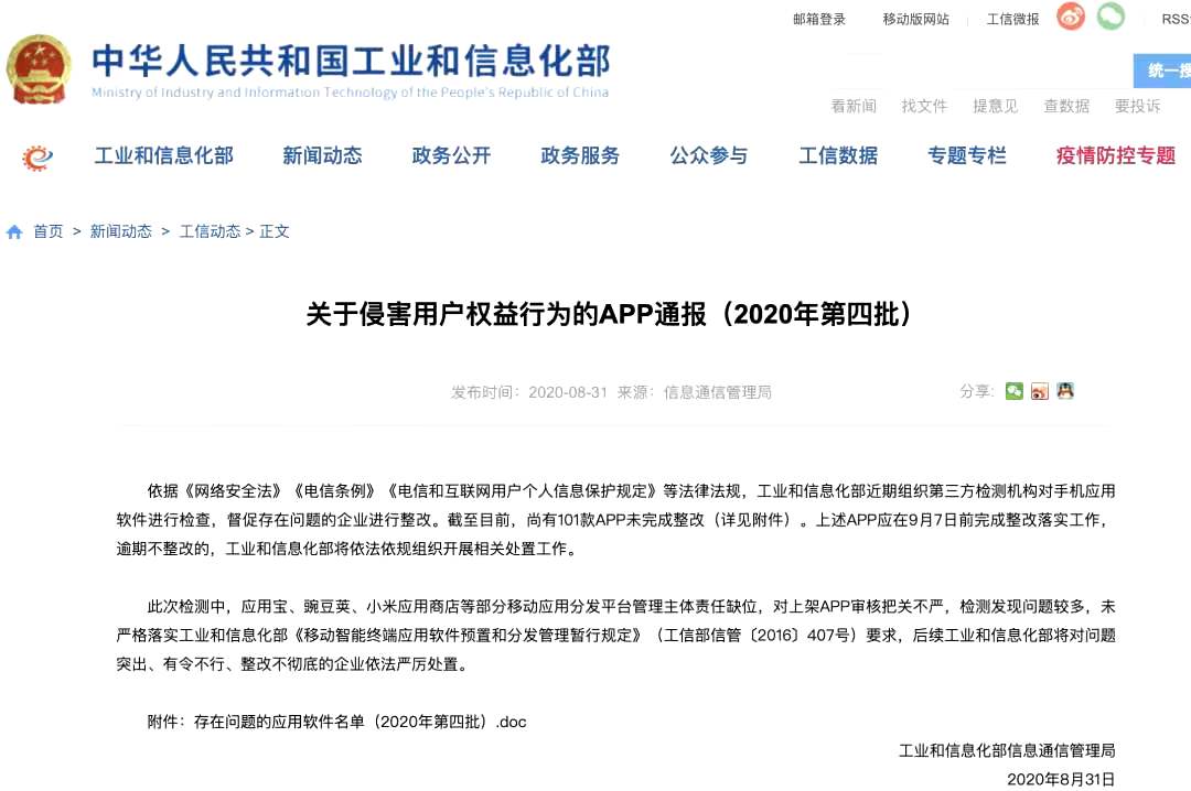 人民网北京8月31日电 据工业和信息化部网站消息,工信部信息通 信管理局发布《关于侵害用户权益行为的APP通报(2020年第四批)》,如下文: