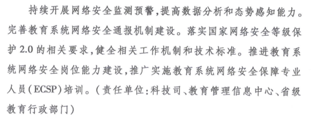 教育部于2020年2月26日发文《2020年教育信息化和网络安全工作要点》里面明确提出了要落实国家网络安全等级保护2.0的相关要求,健全相关工作机制和技术标准。