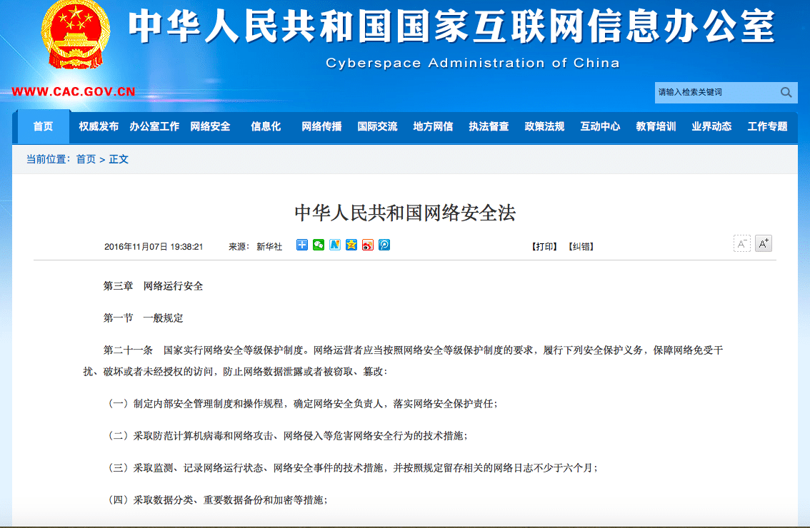 《中华人民共和国网络安全法》【第二十一条】国家实行网络安全等级保护制度。网络运营者应当按照网络安全等级保护制度的要求,履行下列安全保护义务,保障网络免受干扰、破坏或者未经授权的访问,防止网络数据泄露或者被窃取、篡改。