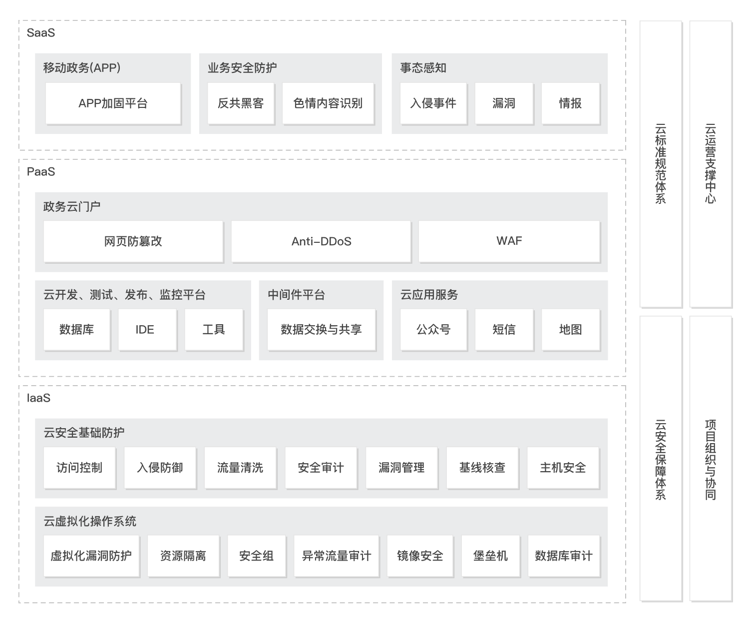 政务云安全整体设计框架与私有云部署的框架相结合,通过基础网络安全防护、云平台操作系统、应用安全和管理安全保障平台整体安全合规性,再通过安全资源池,结合SaaS安全服务满足租户与业务个性化安全需求,实现平台整体安全与租户业务个性化安全相结合。